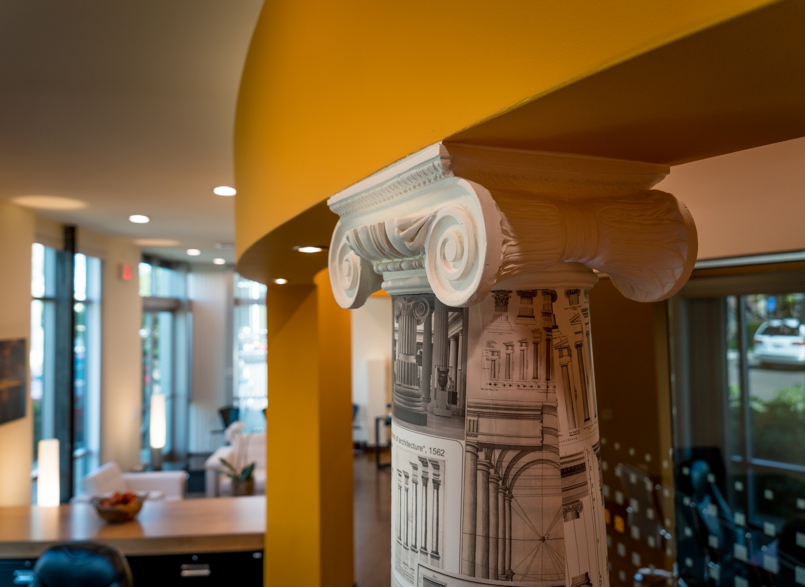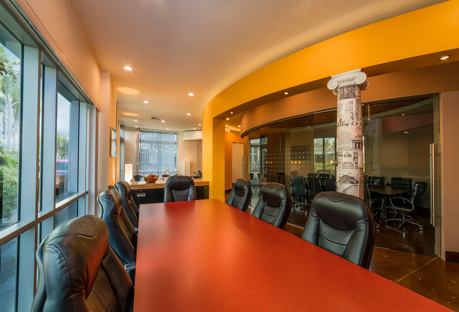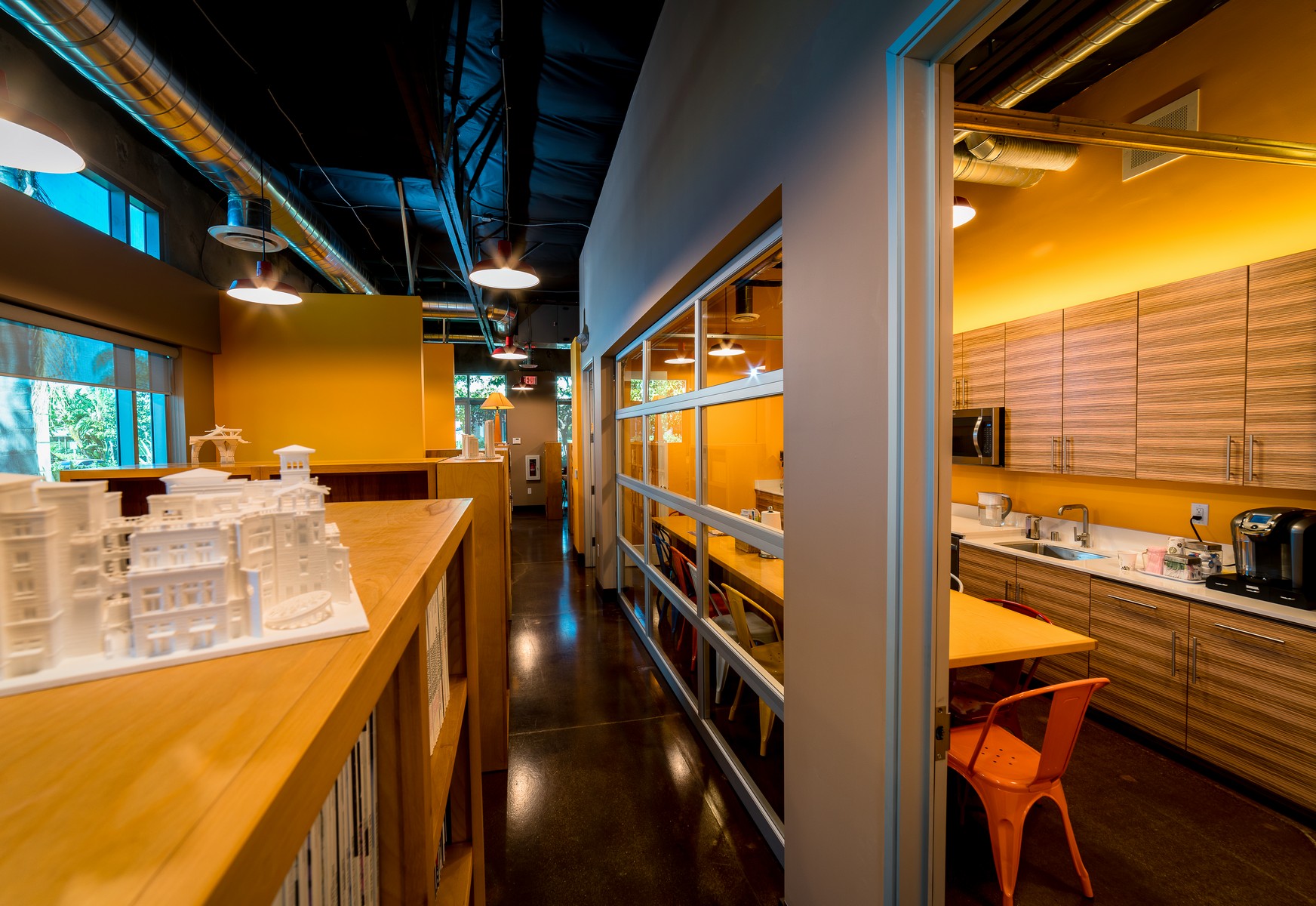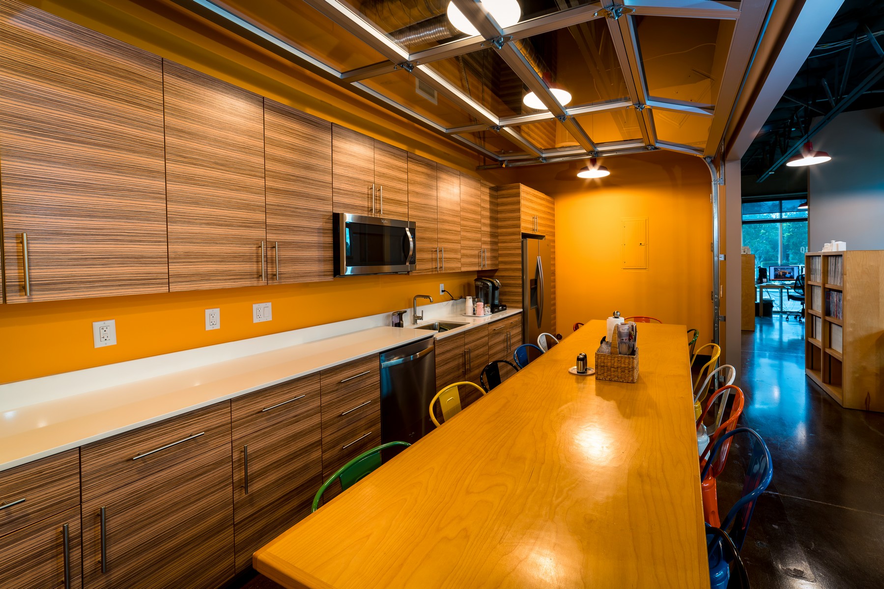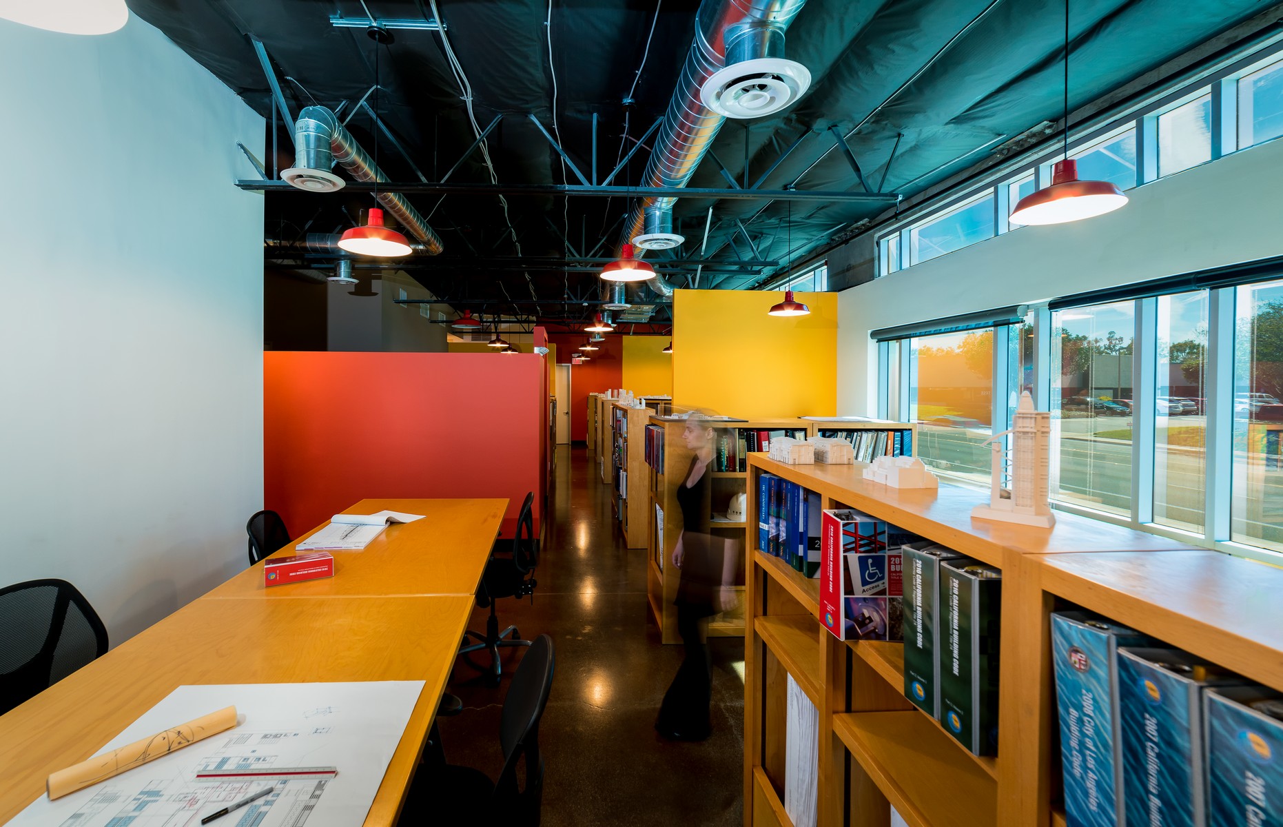 The design masterfully balances open space with defined purpose. A key intervention was the demolition of the dim, narrow kitchenette, replaced by a generously expanded kitchen and lunch area. This new space is separated from the main office by an overhead glass garage door, a clever architectural element that offers the flexibility to open the area for large gatherings while ensuring both light and transparency are maintained. Workstations are thoughtfully arranged using widely spaced pony walls and freestanding bookshelves, creating a flexible environment that adapts to the office’s evolving needs—a true reflection of the firm’s dynamic and creative culture.